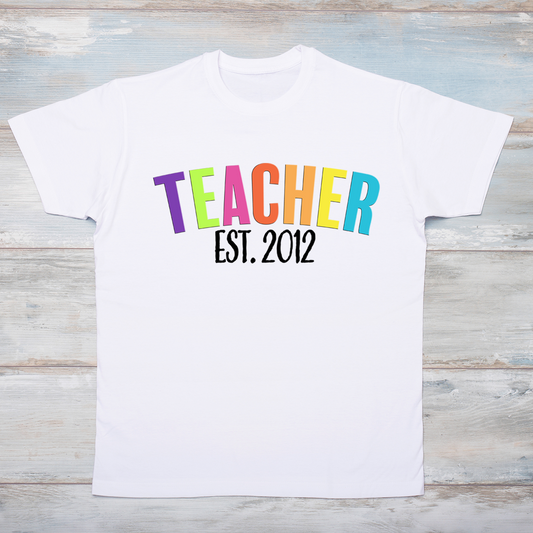 TEACHER with Established Date, multi color letters T-Shirt