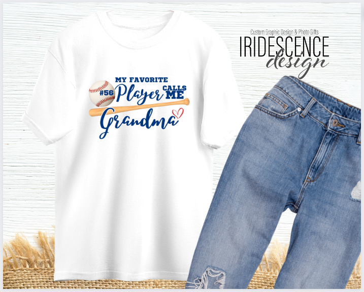My Favorite Player calls me Grandma Baseball T-shirt. Customize with fan type, player number, and colors. Don't worry, the image doesn't fade, crack or peel. It is dyed into the fabric (you can't feel it on the shirt). The image is vibrant, full color, and will appear as it is sent. Dimensions of the image are up to 8.5 x 14.